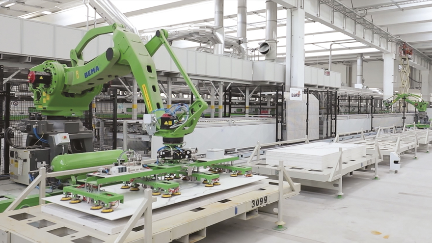 Ceramic tiles 01 July 2025 There are 122 companies in Italy, which produced 369.8 million square metres in 2024 and employ 18,009 people directly. Over 90% of production takes place in the Emilia-Romagna region, particularly in the industrial district of Sassuolo, which stretches between the provinces of Modena and Reggio Emilia. In 2024, the sector sold a total of 378.3 million square metres, of which approximately 80% was destined for foreign markets. Sales in Italy in 2024 amounted to just under 85 million square metres, representing approximately 20% of the sector's sales in terms of quantity. Among the various types of product, porcelain stoneware is of paramount importance in Italian production, accounting for over 90% of the total. However, there are also single-fired, double-fired and other niche products. The total turnover of Italian tile manufacturers reached €6,062 million in 2024, with exports accounting for almost €5 billion (approximately 85%) and domestic sales accounting for €1.1 billion (approximately 15%). The Italian ceramic tile industry stands out for its high propensity to invest, which has accounted for an average of around 7% of total turnover over the last decade. In 2024, investments fell sharply, down 19.4% to €382 million, but still accounting for 6.3% of turnover. Outside Italy, there are also 17 manufacturing companies controlled by nine Italian groups. These foreign companies, located in various European countries and the United States, employ a total of over 3,000 people and produced approximately 74 million square metres in 2024, with a total turnover of €904 million, resulting from sales of €487 million from activities in Europe and the remaining €417 million from sales in North America. Considering the internationalisation of production, the Italian ceramic tile industry has a global value of approximately €7 billion. Photogallery of Ciclo di cottura Image "0" Applicazioni Image "1" Movimentazione grandi lastre Image "2" Movimentazione Image "3" cottura Image "4" macinazione atomizzatore Image "5" piastrella a crudo Image "6" pressatura Image "7"