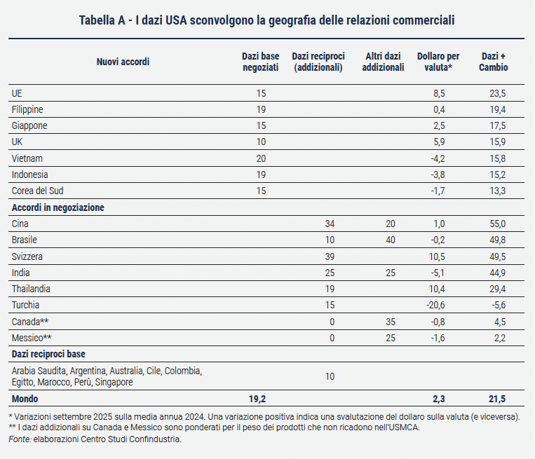 Vai alla lista notizie Notizie Gli accordi commerciali ridisegnano gli scambi internazionali 18 febbraio 2026 Commercio e mercati Editoria Materia: CER Giornale Salva nei preferiti Dazi e dollaro debole pesano sull’export europeo in USA, mentre il Mercosur offre nuove opportunità di crescita. Negli ultimi mesi il commercio internazionale ha vissuto una profonda trasformazione. Gli Stati Uniti, dopo aver alzato nuove barriere doganali, hanno siglato lo scorso agosto un accordo con l’Unione Europea che ha riscritto le regole degli scambi transatlantici. Pochi giorni dopo, Bruxelles ha chiuso un negoziato atteso da oltre venticinque anni con il Mercosur (ndr. acronimo dello spagnolo Mercado Común del Sur e in inglese Southern Common Market), l’unione economica che riunisce Brasile, Argentina, Uruguay e Paraguay. Due intese che, secondo il rapporto Investimenti per muovere l’Italia presentato dal Centro Studi di Confindustria lo scorso ottobre, stanno ridisegnando gli equilibri del commercio internazionale. Il nuovo regime USA-UE, chiamato Framework on an Agreement on Reciprocal, Fair and Balanced Trade, introduce un sistema di tariffe e impegni reciproci che riflette la nuova fase del protezionismo americano. L’Unione Europea ha azzerato i dazi sui prodotti industriali statunitensi e ha concesso un accesso preferenziale ad alcuni beni agricoli, ricevendo in cambio dazi – non aggiuntivi - del 15% sulla maggior parte dei prodotti europei, con eccezioni per alcuni prodotti come farmaci, aeromobili e risorse naturali non disponibili negli USA. Restano però in vigore le tariffe molto elevate su acciaio e alluminio. Il nuovo scenario rappresenta un incremento complessivo dei costi doganali per i produttori europei, ma ha evitato l’escalation tariffaria minacciata nei mesi precedenti all’accordo. L’accordo contiene anche clausole “non tariffarie” che impongono all’UE di acquistare dagli USA energia, chip per l’intelligenza artificiale e attrezzature militari, e di incentivare nuovi investimenti diretti nei settori strategici americani. Inoltre, il rafforzamento dell’euro nei confronti del dollaro incide significativamente sulla competitività dei beni europei, favorendo ulteriormente la produzione domestica americana. Da inizio anno il dollaro si è svalutato di circa il 14%, amplificando di fatto l’impatto delle tariffe.Secondo le stime del Centro Studi di Confindustria, l’impatto delle tariffe e dell’euro forte potrebbero causare, rispetto a uno scenario senza tariffe, una riduzione delle esportazioni italiane verso gli Stati Uniti pari a 16,7 miliardi di euro, ovvero circa il 2,7% dell’export totale. Nel medio-lungo periodo, questo squilibrio potrebbe spingere le aziende italiane ed europee a trasferire parte della produzione negli USA per evitare dazi e avvicinarsi al mercato nordamericano, soprattutto nei settori strategici per la sicurezza e la leadership tecnologica. Il rischio per la manifattura europea è quindi quello di vedere indebolite alcune delle componenti più vitali del proprio sistema produttivo. In un contesto tanto incerto, l’accordo tra Unione Europea e Mercosur rappresenta invece un segnale di apertura. Dopo un quarto di secolo di trattative, è stato finalmente raggiunto un compromesso che darà vita a un’area di libero scambio di oltre 700 milioni di persone, capace di produrre un quinto del PIL mondiale. L’intesa prevede una liberalizzazione quasi totale del commercio fra le parti in un arco temporale di dieci anni e prevede, a tutela della qualità dei prodotti europei, il riconoscimento di 344 Indicazioni Geografiche della UE tra beni alimentari e bevande. Inoltre, le agevolazioni tariffarie si applicheranno solo a quei prodotti provenienti dal Mercosur che rispettano specifici standard di ambientali, sociali e fitosanitari. L’intesa garantisce inoltre all’UE un accesso privilegiato a materie prime essenziali per la transizione digitale ed energetica. L’accordo si inserisce in un rapporto già consolidato, non solo dal punto di vista degli scambi, ma anche da quello produttivo, poiché molte imprese europee sono già fortemente presenti nei paesi del Mercosur, e può aprire la strada a un rafforzamento degli investimenti diretti europei in Sud America. L’intesa con il Mercosur offre anche l’occasione per riconquistare quote di mercato in un’area dove la Cina ha ormai assunto un ruolo dominante. Secondo il Centro Studi di Confindustria, Germania e Italia saranno tra i maggiori beneficiari della progressiva eliminazione dei dazi, poiché presentano una specializzazione merceologica nei settori in cui la riduzione delle aliquote tariffarie sarà più forte. Saranno soprattutto beni manifatturieri e strumentali – come auto, macchinari, prodotti chimici e farmaceutici – a trarre il vantaggio maggiore, poiché nei prossimi dieci anni vedranno quasi azzerarsi le tariffe attualmente in vigore. Per l’Unione Europea, la firma di nuovi accordi commerciali rappresenta uno strumento chiave per contrastare la frammentazione del commercio mondiale e reagire al crescente protezionismo. Nei prossimi anni la vera sfida sarà mantenere solida la capacità produttiva interna e, al tempo stesso, sfruttare pienamente le opportunità offerte dalle nuove intese internazionali. Fonte grafici: Investimenti per muovere l'Italia. Rapporto di previsione Autunno 2025. Centro Studi Confindustria. Dati al 30 settembre 2025. (Articolo di Andrea Cusi pubblicato in "CER il giornale della ceramica" n. 414, novembre/dicembre 2025)