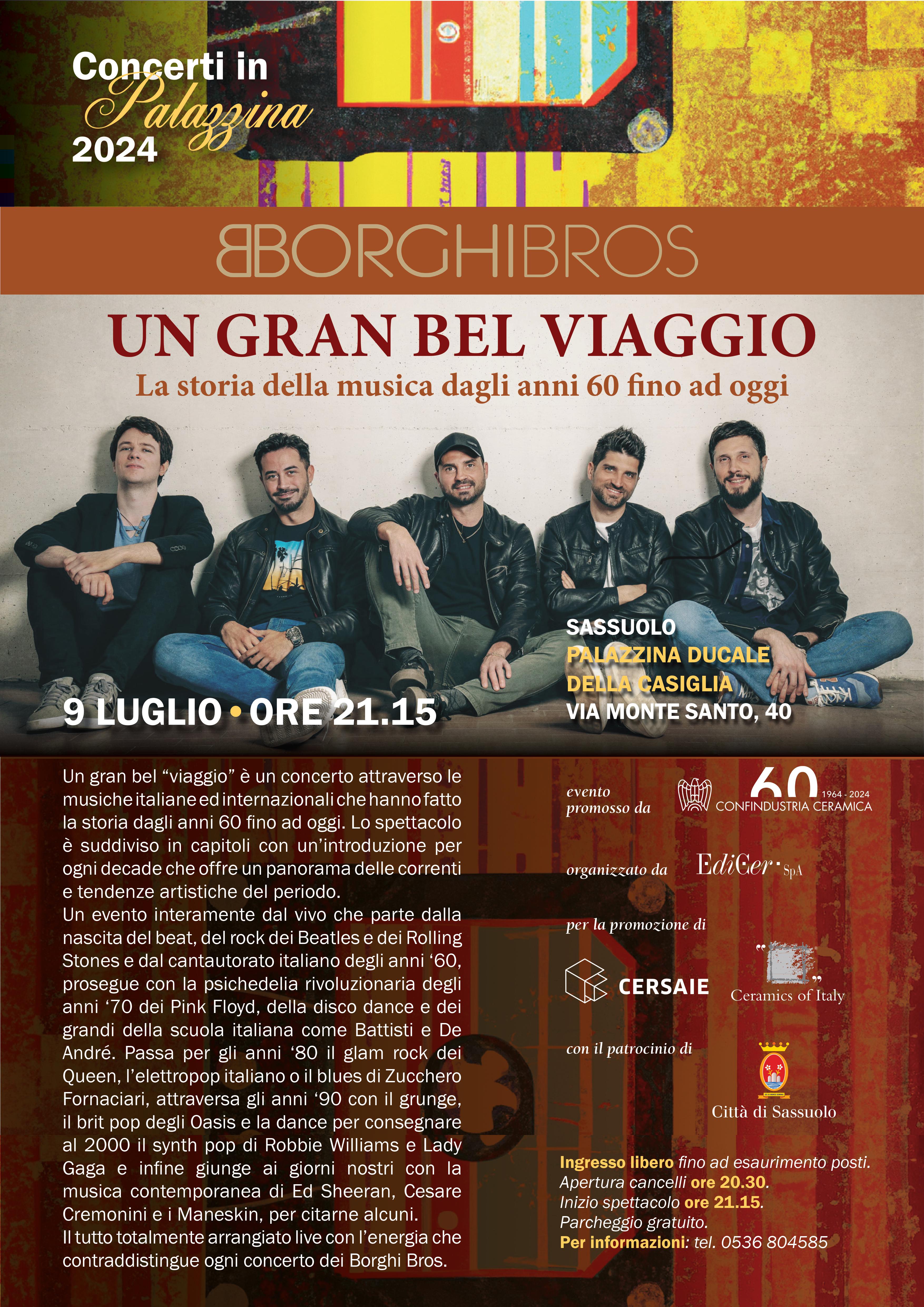 Vai alla lista eventi Evento Concerti in Palazzina 2024 - Borghi Bros Rapporti con gli associati e servizi Concerti in Palazzina 2024 Borghi Bros “Un gran bel viaggio” La storia della musica dagli anni ’60 ad oggi La storia della musica dagli anni ’60 ad oggi Un gran bel “viaggio” è un concerto attraverso le musiche italiane ed internazionali che hanno fatto la storia dagli anni 60 fino ad oggi. Lo spettacolo è suddiviso in capitoli con un’introduzione per ogni decade che offre un panorama delle correnti e tendenze artistiche del periodo. Un evento interamente dal vivo che parte dalla nascita del beat, del rock dei Beatles e dei Rolling Stones e dal cantautorato italiano degli anni ‘60, prosegue con la psichedelia rivoluzionaria degli anni ‘70 dei Pink Floyd, della disco dance e dei grandi della scuola italiana come Battisti e De André. Passa per gli anni ‘80 il glam rock dei Queen, l’elettropop italiano o il blues di Zucchero Fornaciari, attraversa gli anni ‘90 con il grunge, il brit pop degli Oasis e la dance per consegnare al 2000 il synth pop di Robbie Williams e Lady Gaga e infine giunge ai giorni nostri con la musica contemporanea di Ed Sheeran, Cesare Cremonini e i Maneskin, per citarne alcuni. Il tutto totalmente arrangiato live con l’energia che contraddistingue ogni concerto dei Borghi Bros. Informazioni Data 9 luglio 2024 Ora Dalle 21.15 alle 23.30 Luogo Palazzina della Ducale Casiglia Viale Monte Santo 40, Sassuolo Partecipazione Aperto a tutti Allegati Locandina_9luglio_Borghi.pdf