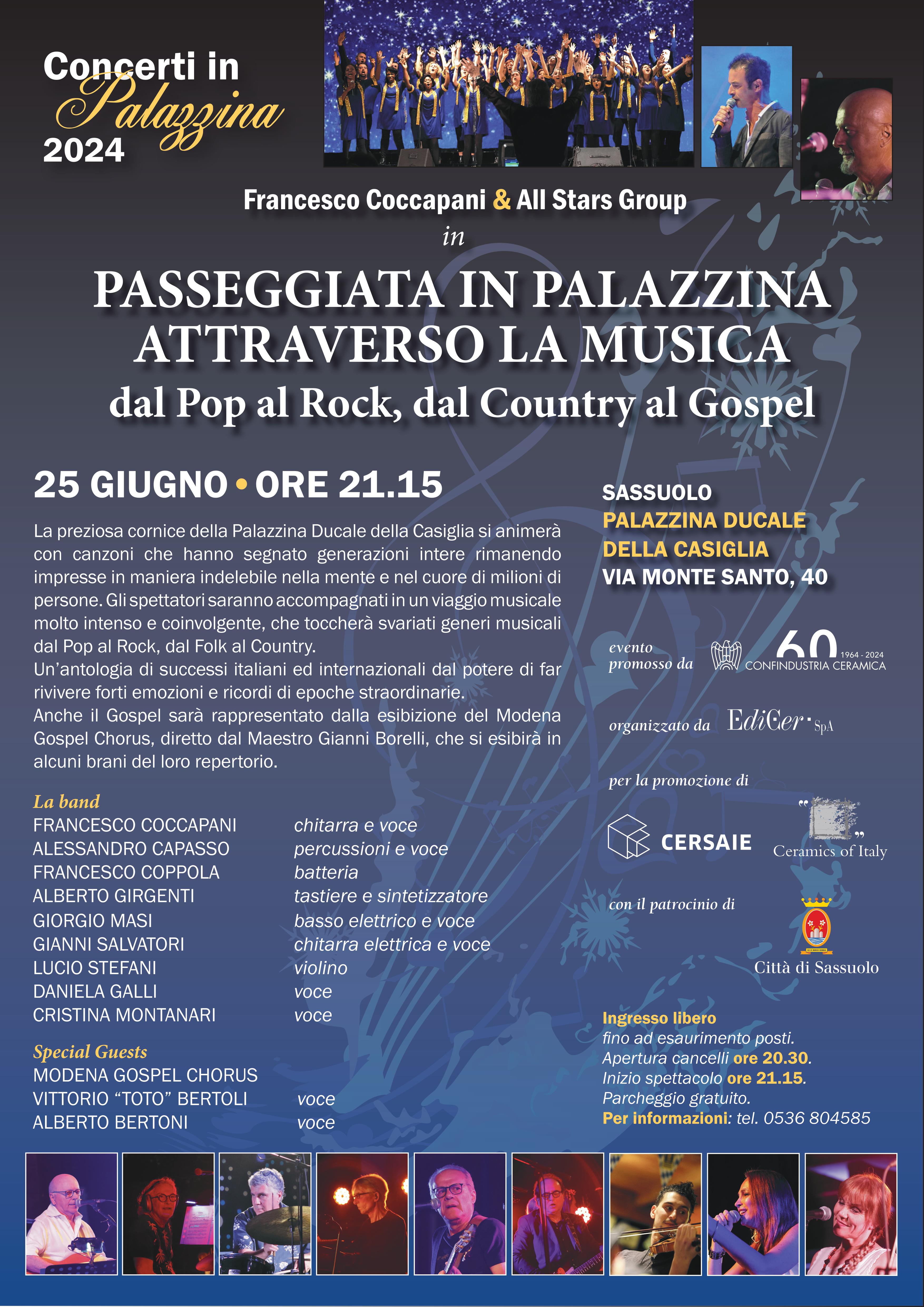 Vai alla lista eventi Evento Concerti in Palazzina 2024 - Francesco Coccapani & All Stars Group Rapporti con gli associati e servizi Francesco Coccapani & All Stars Group “Passeggiata in Palazzina attraverso la musica” La preziosa cornice della Palazzina Ducale della Casiglia si animerà con canzoni che hanno segnato generazioni intere rimanendo impresse in maniera indelebile nella mente e nel cuore di milioni di persone. Gli spettatori accompagnati in un viaggio musicale molto intenso e coinvolgente, che toccherà svariati generi musicali dal Pop al Rock, dal Folk al Country. Un’antologia di successi italiani e internazionali dal potere di far rivivere forti emozioni e ricordi di epoche straordinarie. Anche il Gospel sarà rappresentato dalla esibizione del Modena Gospel Chorus, diretto dal Maestro Gianni Borelli, che si esibirà in alcuni brani di repertorio La band FRANCESCO COCCAPANI, chitarra ALASSENDARO CAPASSO, percussioni e voce FRANCESCO COPPOLA, batteria ALBERTO GIRGENTI, tastiere e sintetizzatore GIORGIO MASI, basso elettrico e voce GIANNI SALVATORI, chitarra elettrica e voce LUCIO STEFANI, violino DANIELA GALLI, voce CRISTINA MONTANARI, voce Special Guest MODENA GOSPEL CHORUS VITTORIO “TOTO” BERTOLI, voce ALBERTO BERTONI, voce Informazioni Data 23 luglio 2024 Ora Dalle 21.15 alle 23.30 Luogo Palazzina della Ducale Casiglia Viale Monte Santo 40, Sassuolo Partecipazione Aperto a tutti Allegati Locandina_23 luglio.pdf