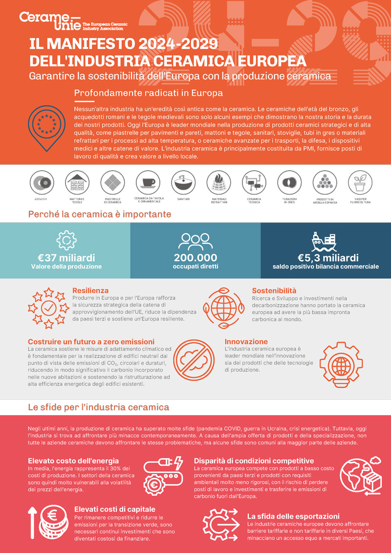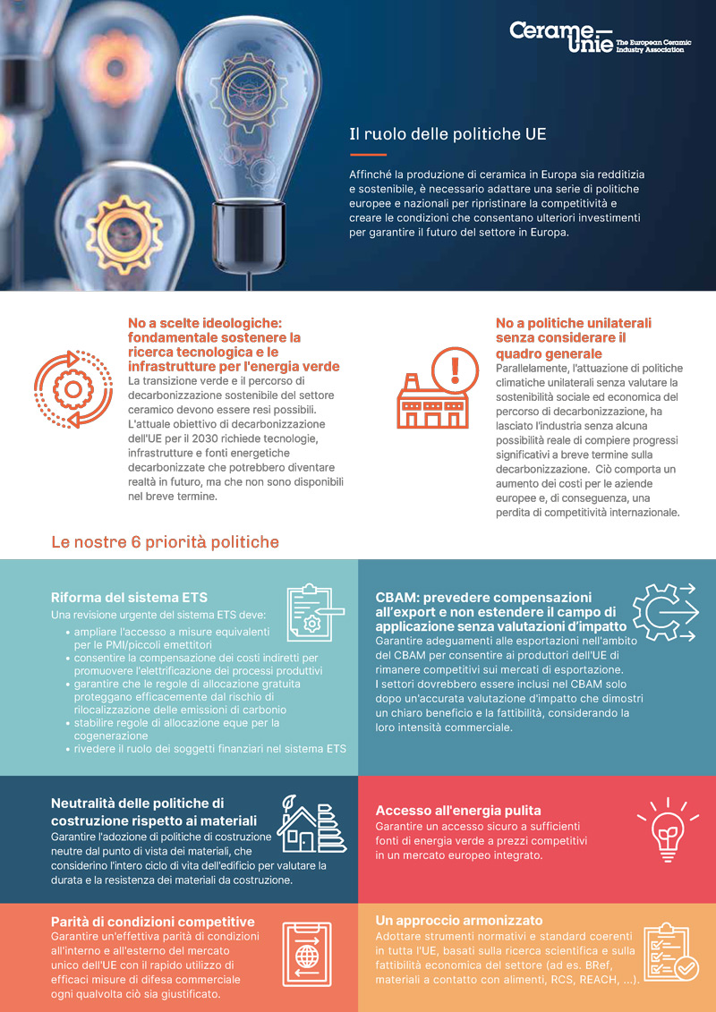 Vai alla lista attività La nostra attività Il Manifesto 2024-2029 dell'Industria Ceramica Europea Il Manifesto 2024-2029 di Cerame-Unie (la federazione europea di settore di cui l’Associazione fa parte) delinea le priorità del settore della ceramica europea per la nuova legislatura europea. Perché continui ad essere possibile produrre ceramica in Europa – un materiale fondamentale per il raggiungimento degli obiettivi di sostenibilità dell’UE – è necessario che siano attuate politiche di lotta al cambiamento climatico che tengano in considerazione anche la sostenibilità sociale ed economica del necessario percorso di decarbonizzazione. In questo senso, riteniamo imprescindibile la riforma del sistema ETS, che deve: consentire la compensazione dei costi indiretti per promuovere l'elettrificazione dei processi produttivi; ampliare l'accesso a misure equivalenti per le PMI/piccoli emettitori; garantire che le regole di allocazione gratuita proteggano efficacemente dal rischio di rilocalizzazione delle emissioni di carbonio; stabilire regole di allocazione eque per la cogenerazione; e rivedere il ruolo degli enti finanziari nel sistema ETS. In tema di energia, l’industria auspica che possa essere assicurato un accesso a sufficienti fonti di energia verde, a prezzi competitivi ed in un mercato europeo integrato. Per quanto riguarda il commercio, in qualità di settore fortemente orientato all’esportazione, riteniamo anche che sia importante garantire misure specifiche per le esportazioni nell'ambito del CBAM (Carbon Border Adjustment Mechanism) per consentire ai produttori dell'UE di rimanere competitivi sui mercati esteri. A questo si aggiunge la necessità di salvaguardare un’effettiva parità di condizioni all’interno e all’esterno del mercato unico dell’UE, con il rapido utilizzo di efficaci misure di difesa commerciale quando necessario. Il documento si posiziona inoltre in favore dell’adozione di politiche basate sulle evidenze della ricerca scientifica. In questo senso l’industria europea della ceramica si posiziona a favore di politiche neutre dal punto di vista dei materiali da costruzione, che tengano considerino l’intero ciclo di vita, compresa la loro durata e resistenza; e di strumenti normativi e standard (es. BRef, materiali a contatto con gli alimenti, RCS, REACH, ...) armonizzati in tutta l’UE. Scarica il Manifesto Vedi anche La ceramica italiana e l’Emission Trading (ETS): perché il sistema va corretto Analisi del settore ceramico all’interno del Sistema EU ETS Analisi del settore ceramico all’interno del Sistema delle misure equivalenti (OPT OUT) Foto Manifesto - pag1 Immagine "0" Manifesto - pag2 Immagine "1"