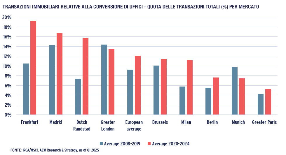 Vai alla lista notizie Notizie La nuova vita degli uffici non utilizzati 24 novembre 2025 Edilizia Editoria Materia: Newsletter Salva nei preferiti La riconversione immobiliare degli spazi direzionali raggiunge in Europa il 30% dei volumi Le riconversioni immobiliari, specie quelle degli uffici, rappresentano una tendenza chiave in Europa: nei primi quattro mesi del 2025 hanno superato il 30% delle transazioni misurate per superficie calpestabile, rispetto al 17% del 2024 e all’8% del periodo post-crisi finanziaria. Spinte da svalutazioni, difficoltà nei rifinanziamenti e normative divenute più flessibili, le conversioni degli spazi direzionali verso usi alternativi (residenziale, studentati, hotel, logistica, self-storage) consentono di far mantenere valore all’immobile, di accedere alla liquidità e si pongono come alternativa più sostenibile alla demolizione. Francoforte e Milano hanno mostrato la crescita più marcata nelle riconversioni tra il 2008–2019 e il 2020–2024, mentre Londra e Monaco hanno registrato variazioni contenute. Nel 2024 gli investimenti nel settore uffici hanno raggiunto i 43 miliardi (+1% sul 2023), ma restano inferiori del 53% rispetto alla media quindicennale. Nei primi quattro mesi del 2025 si attestano a 8 miliardi (-10% anno su anno), con una quota sul totale al minimo storico del 21%. Le grandi operazioni core confermano la concentrazione della domanda, mentre oltre il 40% dei fund manager prevede un aumento dei valori nei prossimi 12 mesi. E la sostenibilità è sempre più centrale: oltre il 70% dei finanziatori esclude asset privi di requisiti ESG o di un piano di riconversione. Il 57% applica condizioni migliori a chi raggiunge obiettivi ambientali o sociali. I meccanismi premiali sono prevalenti, ma le penalizzazioni – se presenti – risultano più incisive, perché legate a monitoraggi regolari. Da uffici a studentati, residence e hotel. È questo il destino di molti uffici in Italia come in Europa per ridurre la vacancy, ovvero il tasso di sfitto, nel settore degli uffici. E se la domanda corre per gli spazi collocati nei centri urbani o nelle aree strategiche, digitali e conformi ai criteri Esg interesse commerciale pressoché nullo per le metrature datate, periferiche o in zone fuori mano. Secondo l’ultimo report sugli uffici di Aew, nelle principali città dove più si orienta lo sviluppo immobiliare direzionale, la percentuale di mq compravenduti a scopo di riconversione è cresciuta di più tra 2020-2024 che negli anni tra il 2008 e il 2019 con una media europea è passata dal 9 al 12% per cento. Nelle capitali del terziario, come Francoforte, i mq transati a scopo riconversione sono raddoppiati passando dal 10 al 20% e subito a seguire Madrid (dal 14 al 17%), ma anche il “conglomerato olandese” (Randstad, che riunisce Amsterdam, Rotterdam, L’Aia e un totale tra 17 città medie tra loro collegate da infrastrutture all’avanguardia), ha visto un incremento di mq a scopo di rigenerazione dal 6 al 17%. In controtendenza, invece, Londra e Monaco. Milano, l’unica città italiana del campione preso in esame da Aew, è quasi vicina al raddoppio: i mq transati a scopo di riconversione sono passati, infatti, da meno del 6% a oltre l’11 per cento. Tuttavia, le riconversioni potrebbero essere frenate, avverte il Rapporto, dall’atteggiamento “avverso al rischio” degli istituti di credito nei confronti degli uffici, un timore che potrebbe limitare la disponibilità di nuovi finanziamenti per lo sviluppo immobiliare. Senza dire che dal 2026 in avanti, la nuova offerta di uffici potrebbe diminuire dal momento che gli investitori cercheranno di diversificare gli investimenti rispetto ad allocarli nello sviluppo di nuovi uffici. D’altra parte, anche Cbre ipotizza un rallentamento nella crescita dello che lo stock di uffici che aumenterà dello 0,7% annuo nei prossimi due anni, rispetto all’1,3% annuo nel periodo 2003-2024. Restando sul mercato degli uffici, i volumi delle transazioni di uffici in Europa, nel 2024, sono calati del 53% rispetto alla media storica degli ultimi 15 anni e sul volume totale delle transazioni gli uffici hanno toccato il minimo storico del 21% nel primo trimestre del 2025. Ma se in Europa c’è l’aspettativa che i valori miglioreranno (anche perché si stimano comunque rendimenti vicini al 5%), questo non accade per gli Stati Uniti dove si prevede resteranno in calo. Concentrandoci sull’Italia, secondo una ricerca Jll-JangLasalle, complessivamente, in Italia, il segmento degli uffici ha fatto registrare, nei primi sei mesi del 2025, investimenti per circa 1,4 miliardi, con un aumento del 43% sul I semestre 2024. Particolarmente positivo il secondo trimestre con circa 700 milioni, raddoppiando i volumi rispetto allo stesso periodo del 2024 (circa 360 milioni). Secondo le analisi di JLL, il mercato dell’office leasing in Italia ha registrato circa 240.000 mq di take-up nei primi sei mesi del 2025. La fetta più consistente spetta a Milano con circa 200.000 mq, seguita da Roma con circa 40.000 mq. Il mercato degli uffici in generale conferma segnali di vitalità, con una crescente attenzione alla qualità degli spazi e alla centralità. Il capoluogo lombardo conferma il suo ruolo di motore del mercato immobiliare direzionale in Italia. Con circa 200.000 mq di take-up, ai quali si aggiungono 10.000 mq di sublocazioni, Milano mostra una crescita del 18% rispetto al primo semestre 2024. Il mercato è dominato da spazi di grado A, che rappresentano circa l’80% dell’assorbimento. La preferenza per immobili di alta qualità e ben posizionati si riflette nella concentrazione delle operazioni: circa il 50% del take-up è avvenuto nelle aree centrali e nel CBD (Central Business District), con un focus particolare su Porta Nuova, che ha visto le tre transazioni più importanti del periodo per metratura, per un totale di circa 30.000 mq. A Roma, nel primo semestre 2025, si registra un take-up di circa 4
