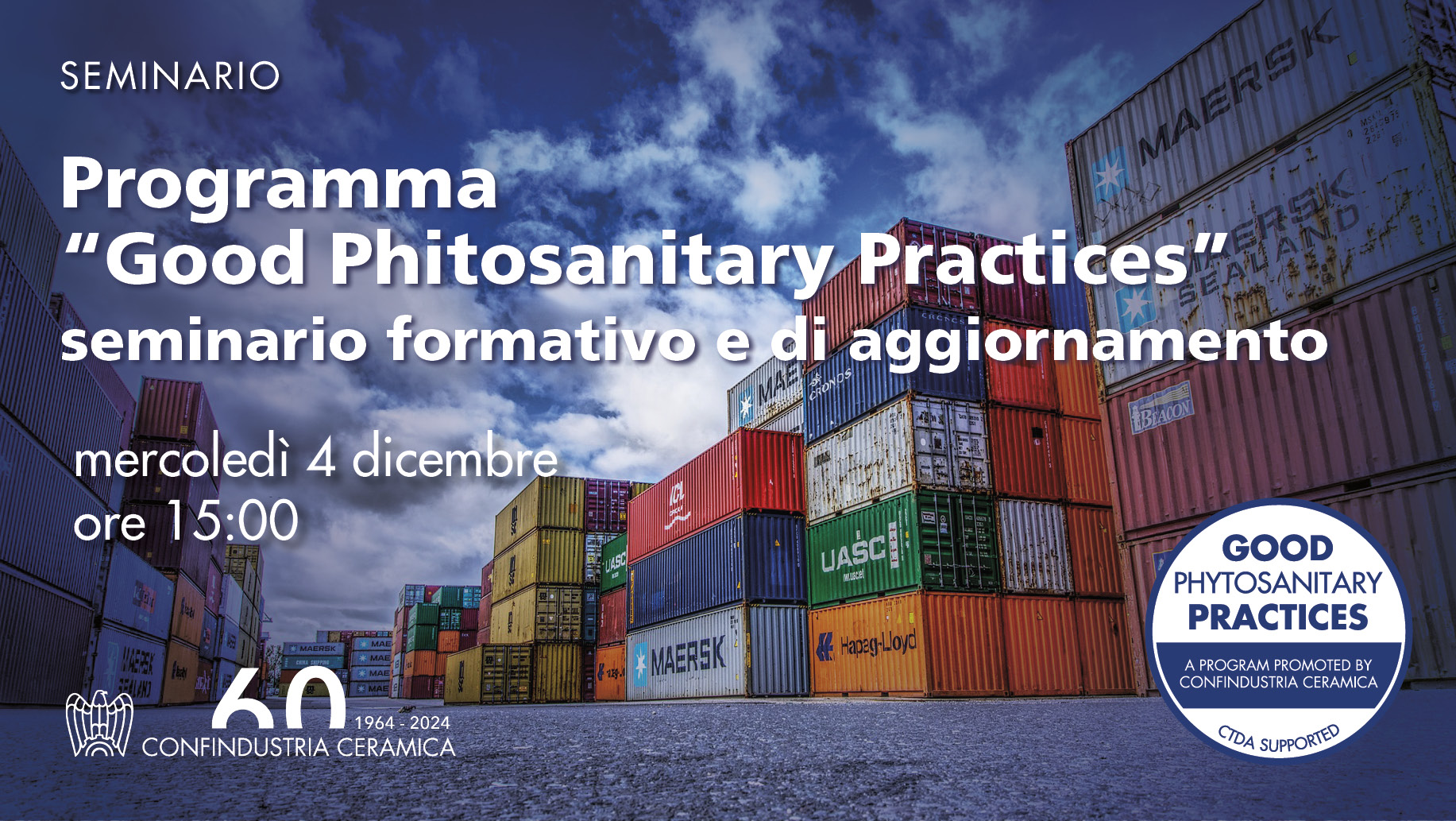 Vai alla lista eventi Evento Programma "Good Phitosanitary Practices" - seminario formativo e di aggiornamento Commercio e mercati Materie: Commercio internazionale Accesso ai mercati esteri Questo contenuto è riservato agli associati Accedi Informazioni Data 4 dicembre 2024 Ora Dalle 15:00 alle 18:00 Luogo Confindustria Ceramica - viale Monte Santo 38, Sassuolo Partecipazione Riservato agli associati Allegati Enrico Lupi_04_12_2024.pdf L.Froio_04_12_2024.pdf Rossano Resca_04_12_2024.pdf Eni Borshi - Abras_04_12_2024.pdf