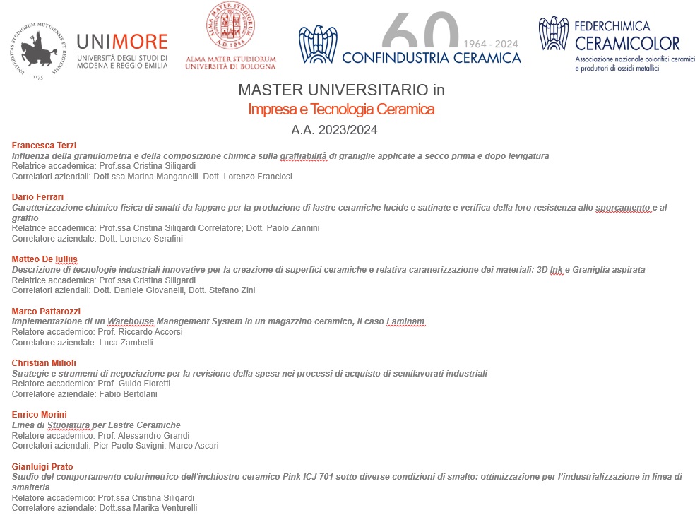 Vai alla lista notizie Notizie Si conclude la 3° edizione del Master in Impresa e Tecnologia ceramica 15 luglio 2024 Education e Formazione Materia: Università e Post Laurea Salva nei preferiti Mercoledì 17 luglio 2024 a partire dalle ore 9.00 presso la sede di Confindustria Ceramica Si terrà mercoledì la prima sessione di discussione delle tesi del Master in Impresa e Tecnologia ceramica giunto alla sua terza edizione. Sono sette gli studenti che concluderanno il loro percorso di alta formazione. La seconda sessione si terrà nel mese di settembre. Allegati Locandina Master.jpg